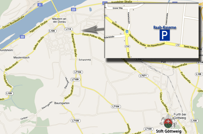 Autobahn A1 aus Richtung Wien (60 km) oder Salzburg (220 km) bis Knoten St. Pölten - Abfahrt Richtung Krems (20 km) bis Knoten Traismauer - Abfahrt Richtung Krems bis Abfahrt Mautern